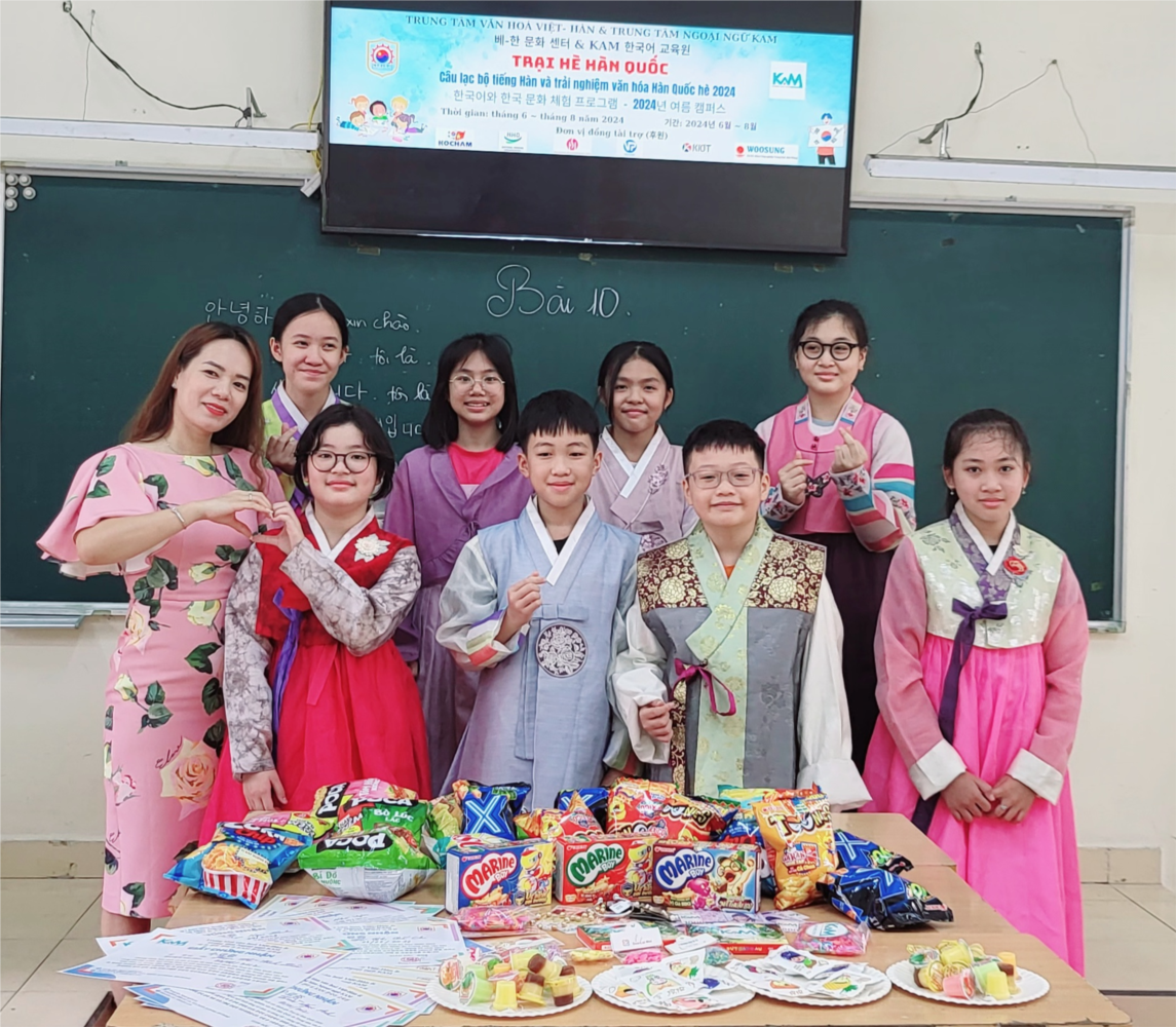 Nhận thức được điều đó, Ban giám hiệu nhà truờng, các thầy cô đã tạo điều kiện để các em học sinh được tham gia Clb tiếng Hàn vào dịp hè do Trung tâm Ngoại ngữ KAM tổ chức. Câu lạc bộ tiếng Hàn không chỉ giúp các em học sinh yêu tiếng Hàn và văn hóa Hàn Quốc được trải nghiệm văn hóa Hàn Quốc mà còn tạo cho các em có một nơi an toàn để vui chơi và thư giãn sau một năm dài học tập, giúp các em có thể tiếp cận thêm với một ngôn ngữ và một nền văn hóa mới một cách tự nhiên, khơi dậy niềm đam mê, yêu thích tiếng Hàn và văn hóa, đất nước, con người Hàn Quốc. Với 10 buổi học, các em không chỉ được học tiếng Hàn, luyện đọc các chữ cái, học cách ghép âm tiết, học từ vựng và những câu chào hỏi và giao tiếp cơ bản mà các em còn được học 10 chủ điểm văn hóa vô cùng thú vị như: